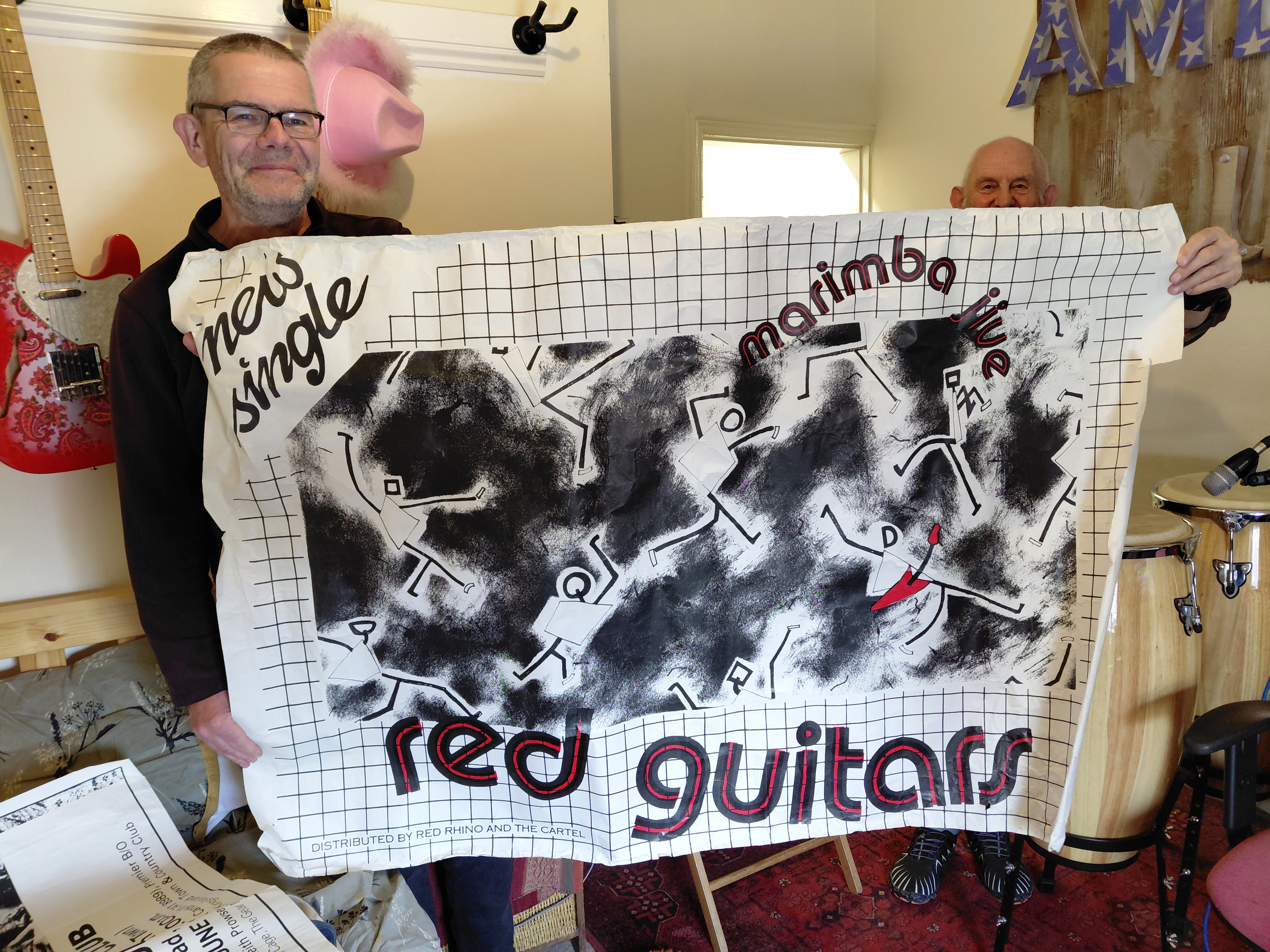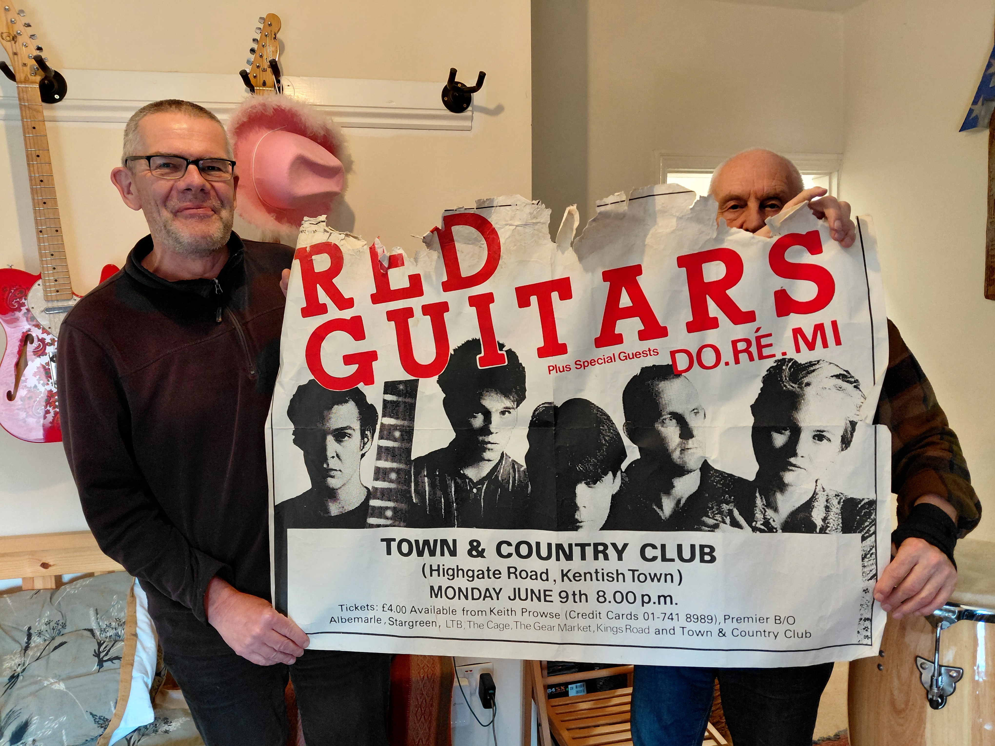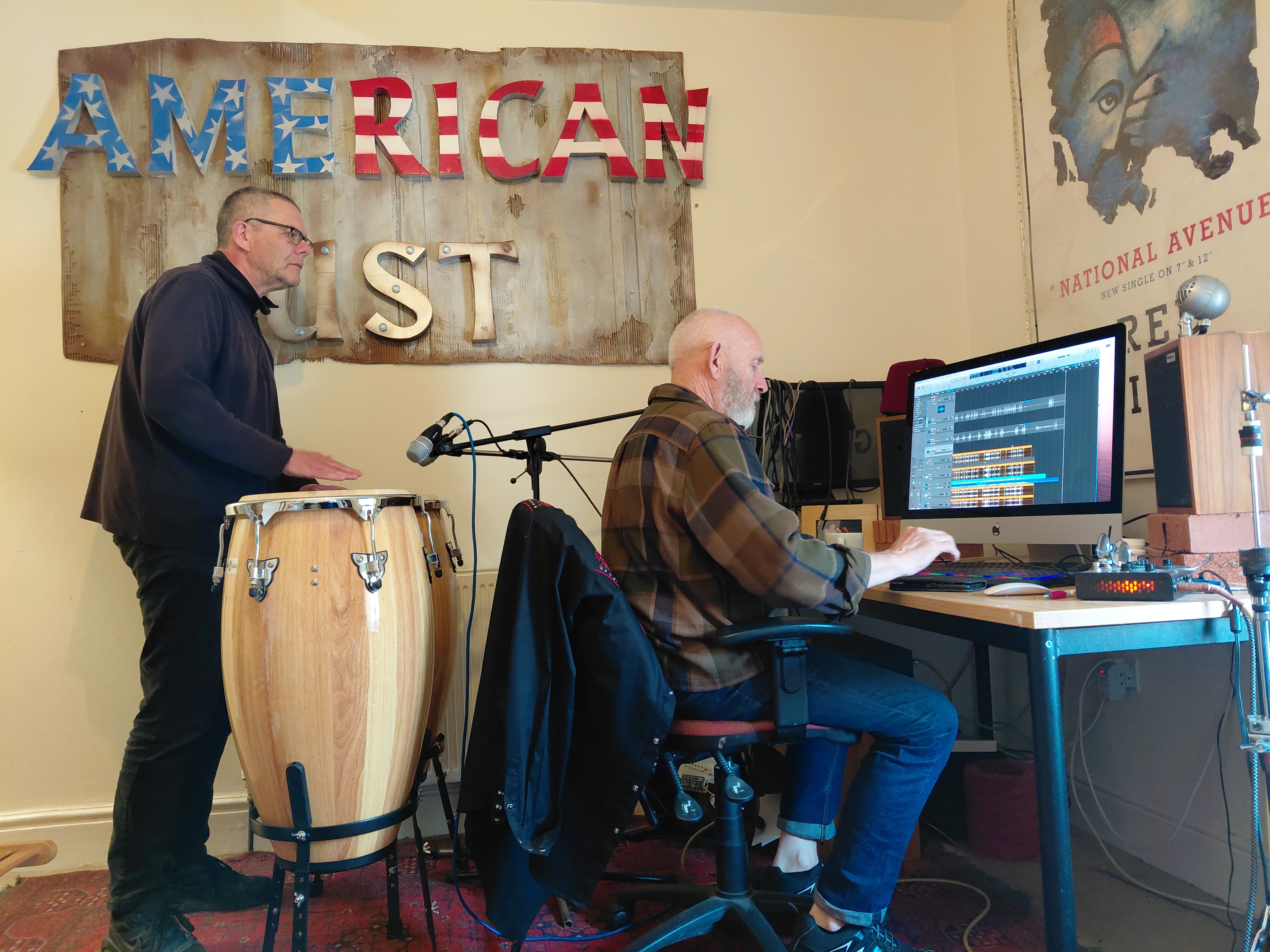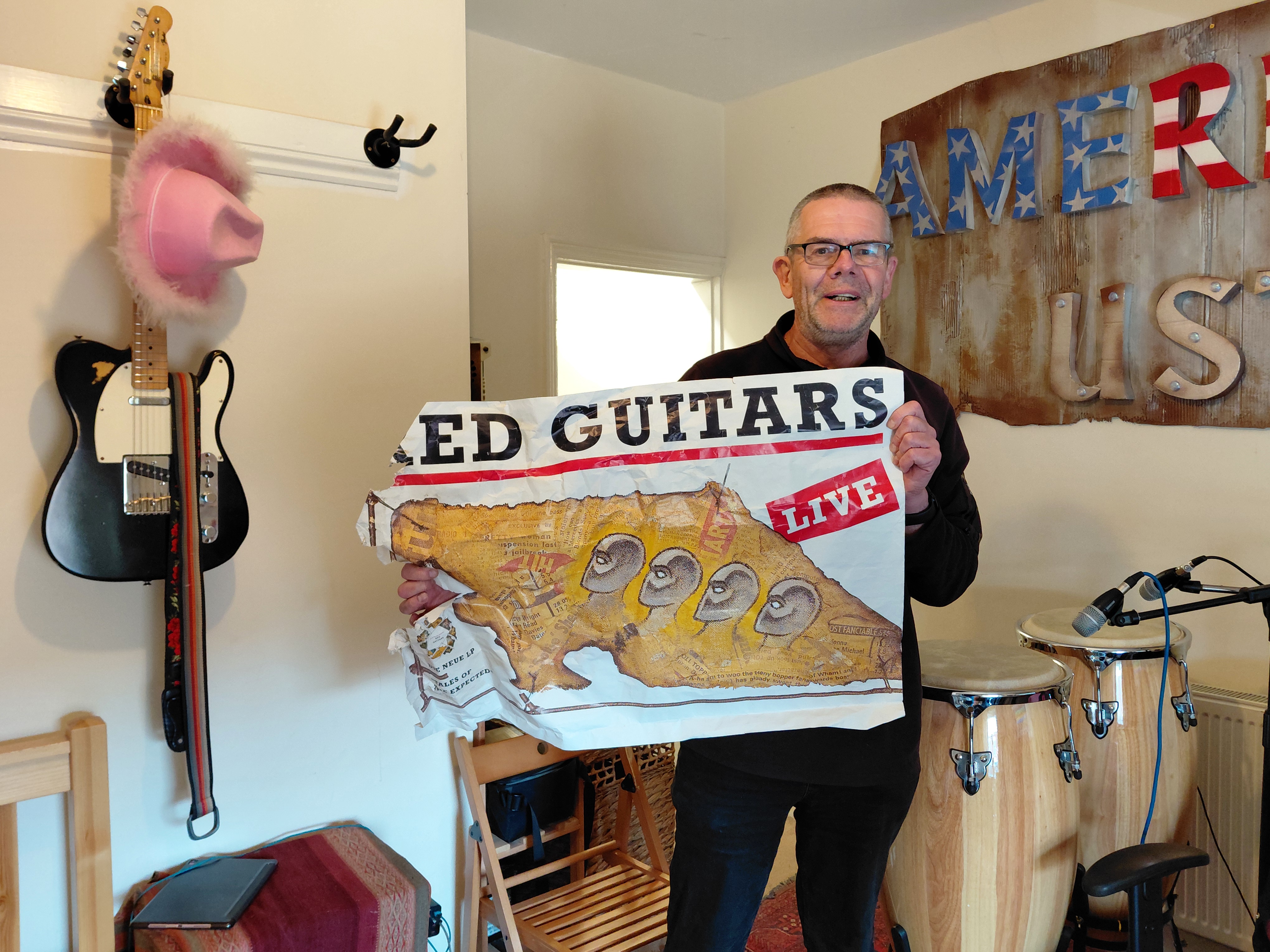 This week’s recording at Rowley Towers – three of us tucked into John’s cake while Hal was in Cape Town, found a great stack of old gig posters, Pepper had a nap, more tea, more cake, did some mixing .. and the congas are in the can!