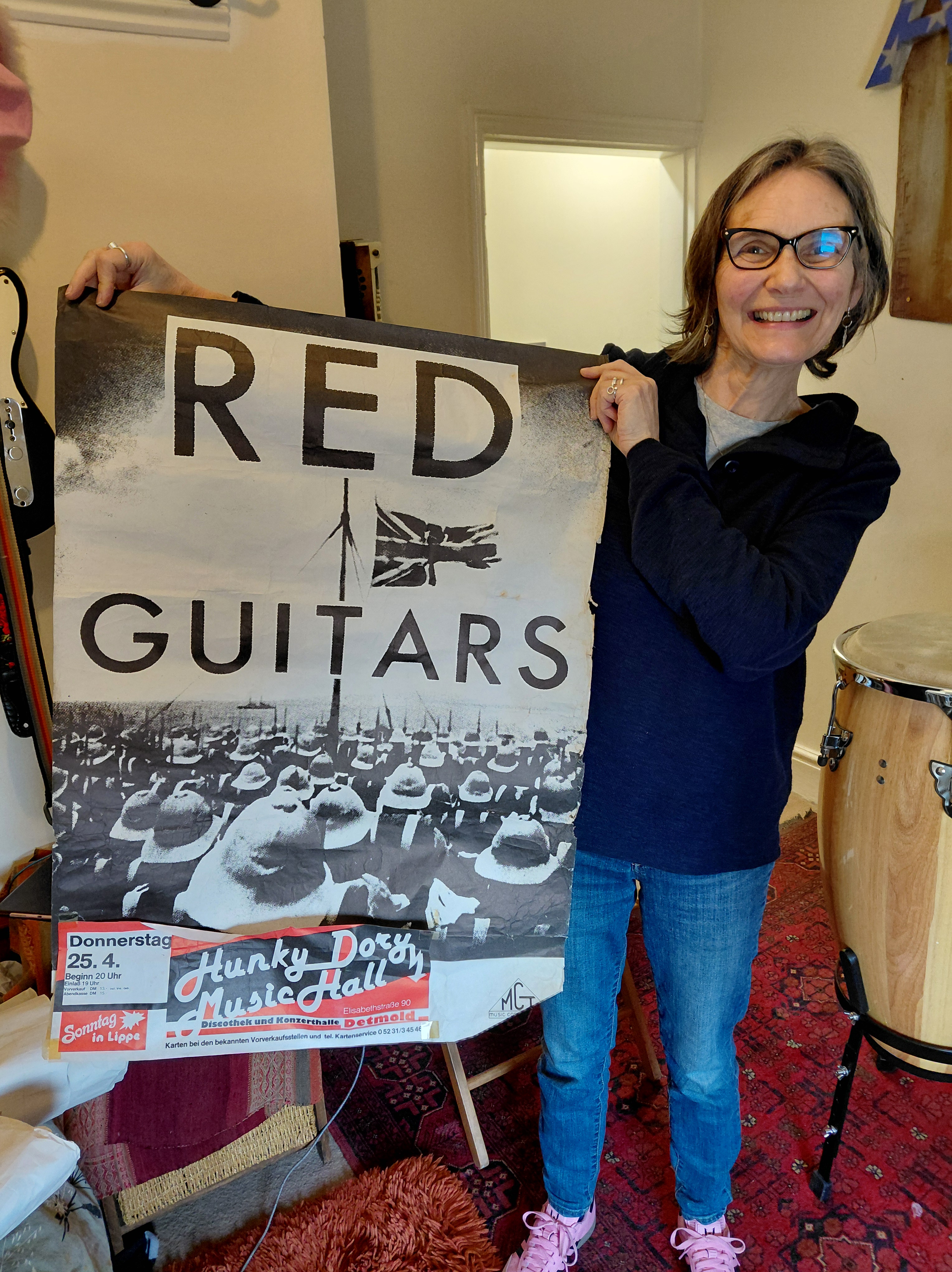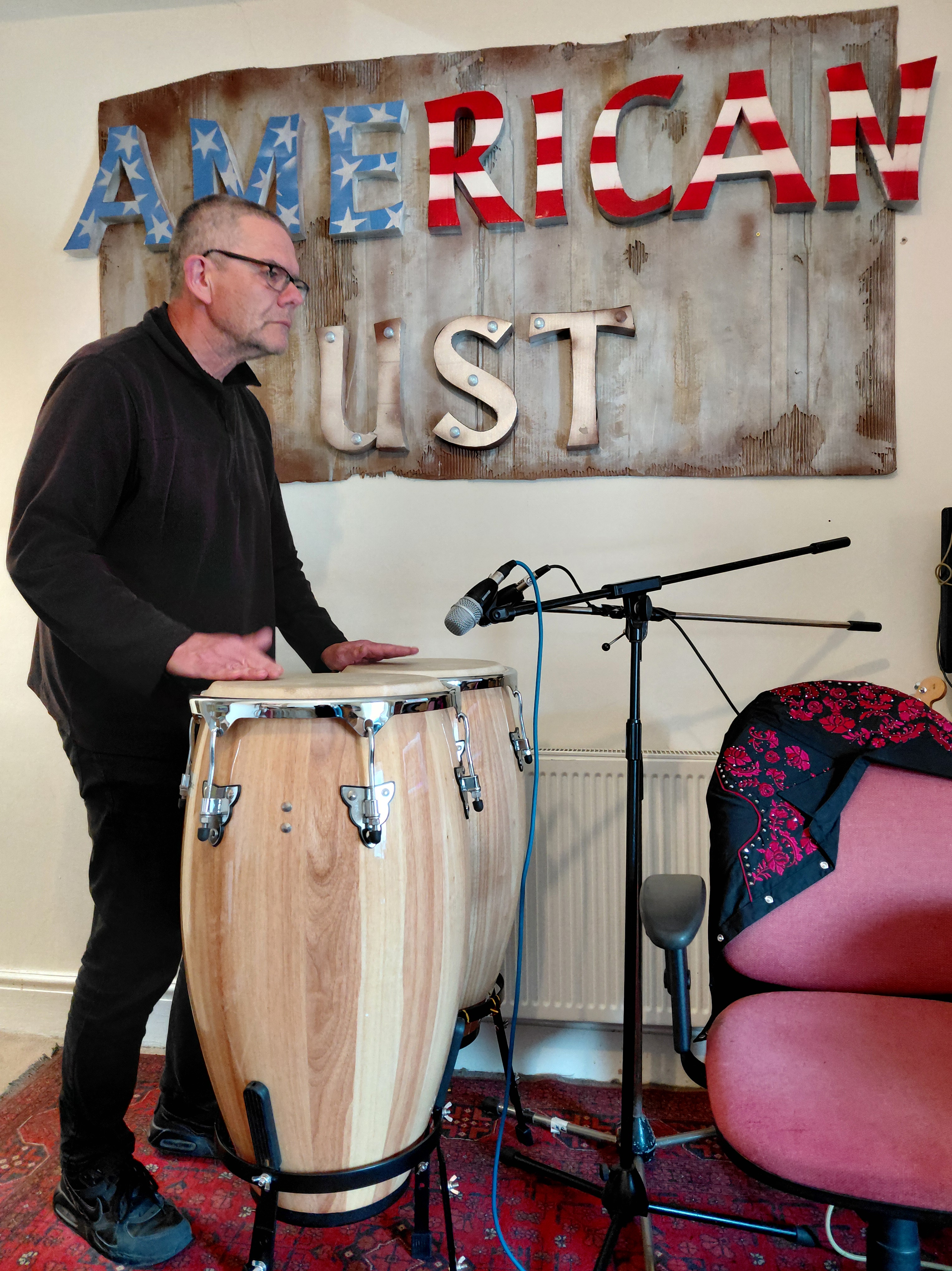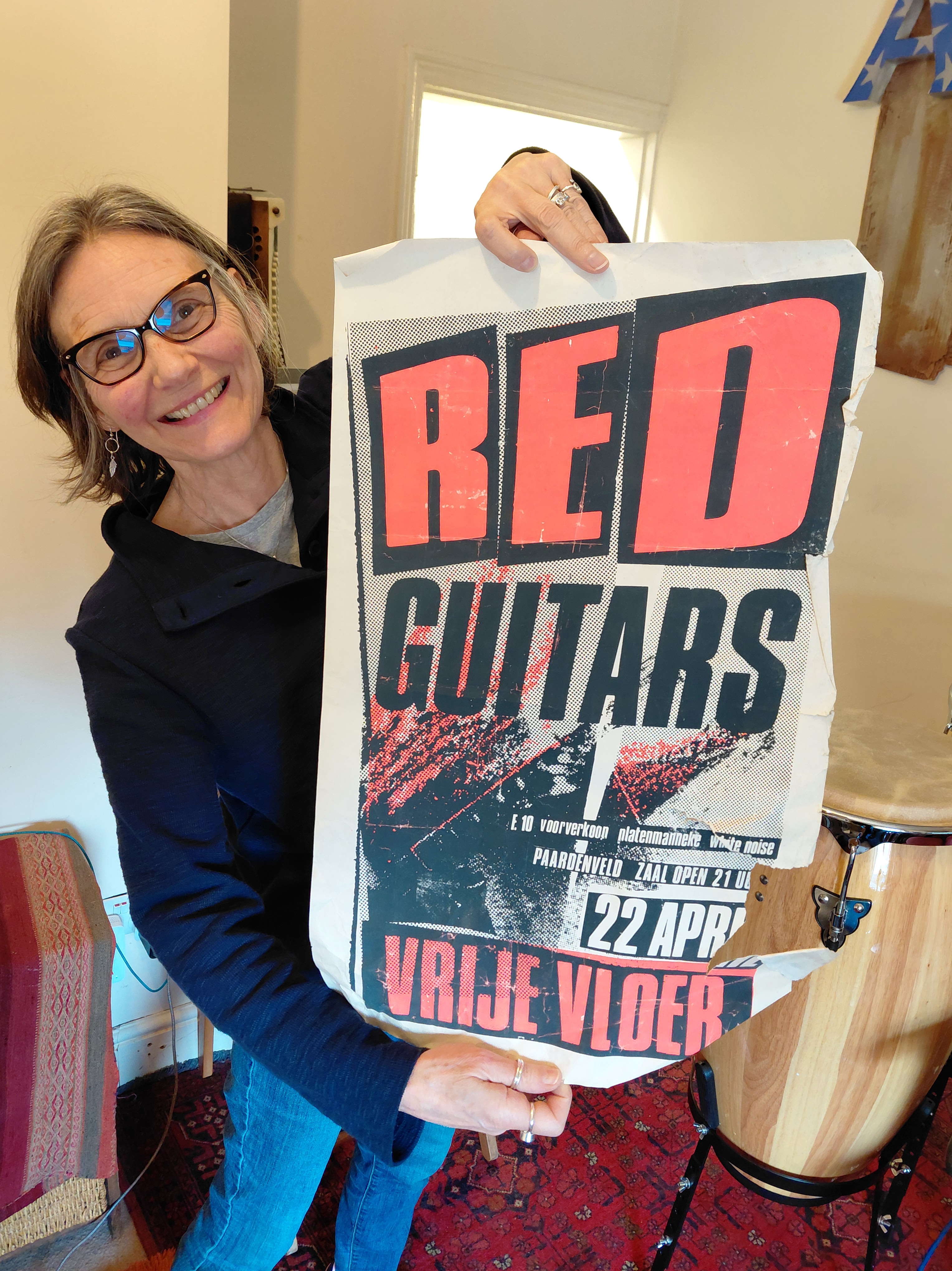 This week’s recording at Rowley Towers – three of us tucked into John’s cake while Hal was in Cape Town, found a great stack of old gig posters, Pepper had a nap, more tea, more cake, did some mixing .. and the congas are in the can!