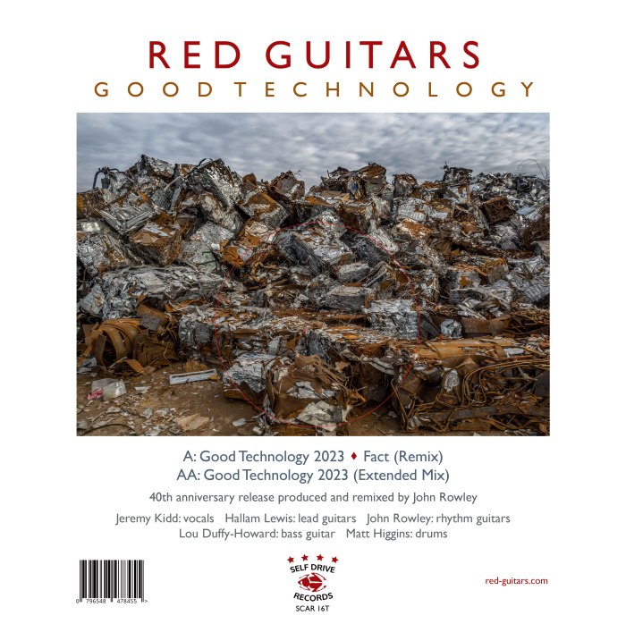 Good Technology 2023 plus Fact (remix) and Good Technology (extended mix) is available on 12” red vinyl from Red Guitars website and good record stores from June 24th 2023. Released on the band’s own Self Drive Records Catalogue number SCAR 16T, distributed by Cargo.